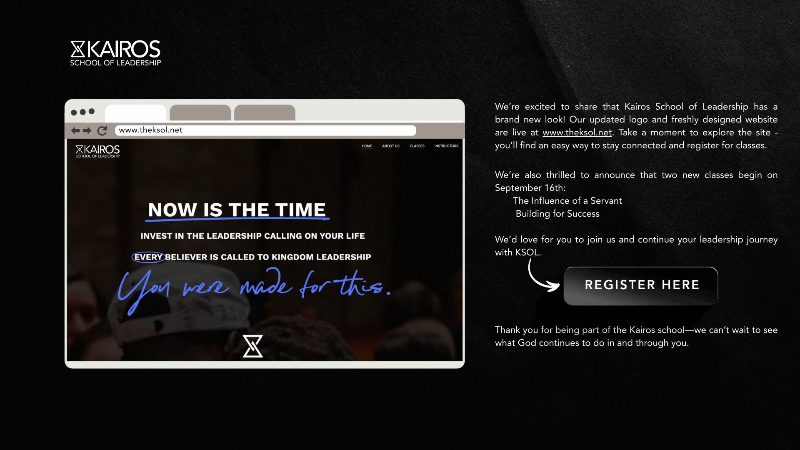 Kairos School of Leadership is a vibrant, hands-on, competency-based, yet practical training system to develop leaders within a local church. It is for Kingdom minded leaders embedded in ministry or the marketplace.